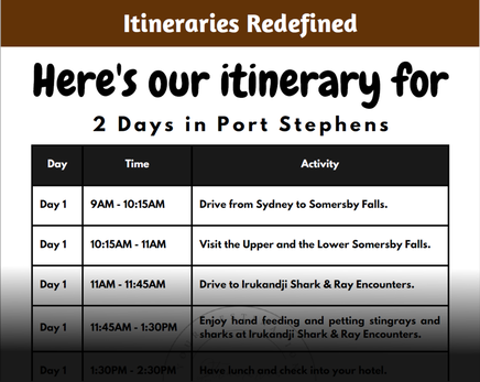 Just 2.5 hours' drive north of Sydney, Port Stephens is a popular destination for tourists and locals alike. With its pristine beaches and stunning nature, Port Stephens is a must-visit destination for anyone looking to experience the best of Australia's east coast. There is so much to see and experience in and around Port Stephens and these cannot be covered in just 2 days however, having said that, this itinerary below attempts to consolidate unique experiences in the region, focusing on first-timers, so you get a taste of what Port Stephens has to offer. We have, in addition, provided other famous attractions in Port Stephens below as well so you can try them out if you'd like and have the time.