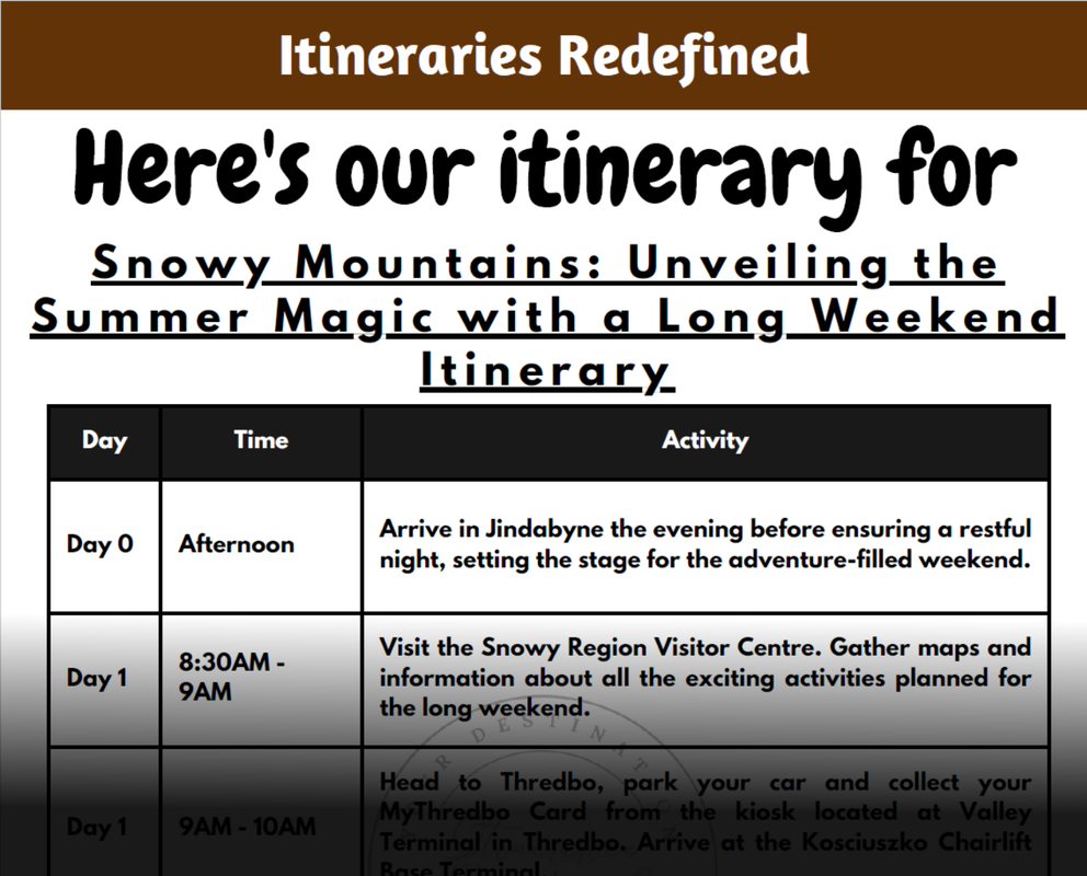 The first light of daybreak brings with it the promise of conquering Mt. Kosciuszko, Australia's highest peak. Our day begins with a visit to the Snowy Region Visitor Centre, where we gather maps, information, and last-minute tips to ensure a successful hike. Here, we also gain valuable knowledge about all the exciting activities planned for our long weekend, setting the stage for an unforgettable adventure.